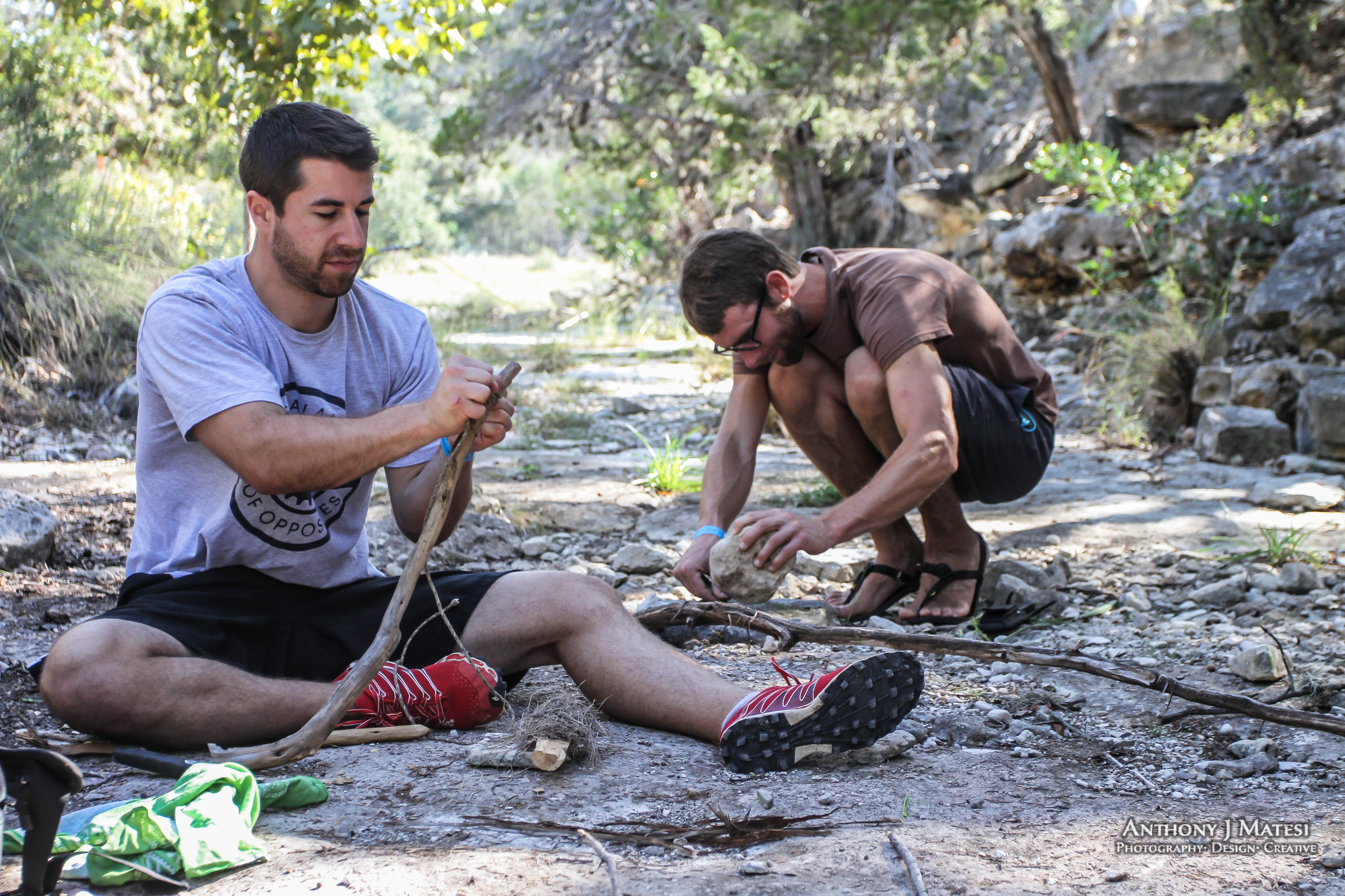 We spent a couple hours working to perfect our bow drill techniques. I don’t recall anyone successfully making fire but there was a lot of smoke. I spent a lot of time trying to find the best materials. From all my studies I knew juniper and sotol stalks were what I should be looking for. I made a solid bow from a juniper branch I found and some paracord. I found that it is really important to have an evenly smooth and cylindrical spindle to achieve the right friction and speed needed to even generate a subtle hint of smoke. It’s also very helpful to have a good stone with a groove in it to apply the necessary pressure on the spindle. After a lot of frustration and some close successes we decided to head back and get some food and rest before packet pick-up. Even though I hadn’t made fire from the bow drill method yet I wasn’t worried because each attempt brought me closer and provided me with more understanding of what to do and what not to do. In my head I kept thinking, “That spindle is key.”