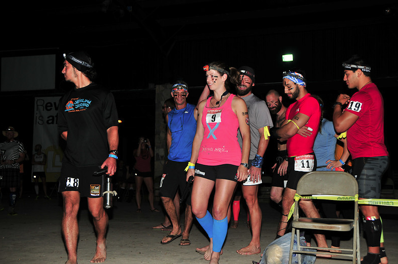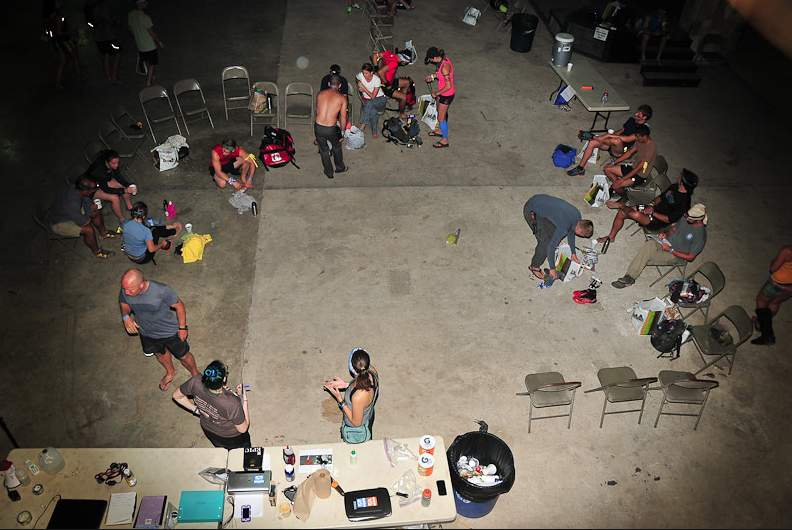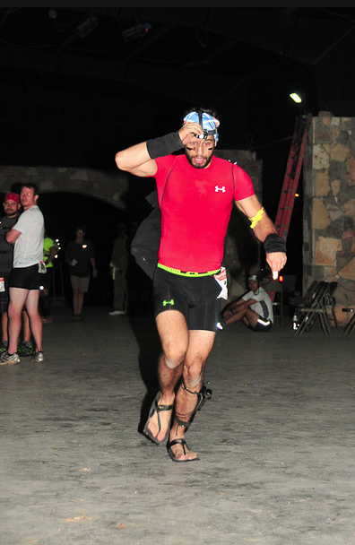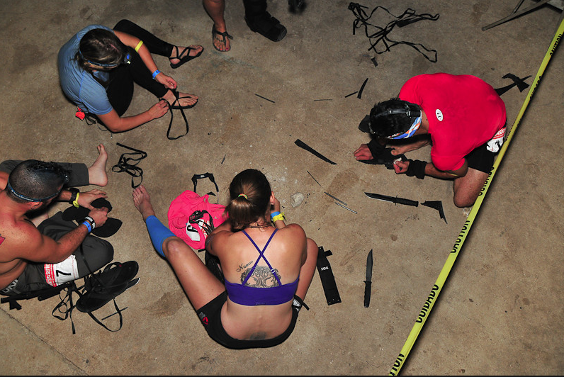 At 4:30AM Josue finally said, “Go.” The race began with us quickly running over to a table set up by the guys at Luna Sandals with all our laces (3 strips each racer) and the option for either one large sole or two smaller foot sized soles. I choose the two and went to work making my sandal with my trusty KaBar. It wasn’t as great at cutting through the rubber as I had hoped. In fact it was awful. Not only did it cut through easily but my haste and tired state failed me and I cut out two left foot sandals before realizing it. I ran over grabbed another foot bed and went to town trying to make this one faster to catch up to everyone else who was mostly moving on to punching their holes for the laces. Shane McKay was the first out and Corinne and Gabi both left shortly after. I fell behind and told Corinne I’d catch up. I quickly finished my sandals tied up my Spartan Race finishers shirt custom made backpack by Tony. As I took off out down the road my pack exploded all over the road. This happened two more times before I added extra para-cord knots on every possible place that the pack could come undone. From here on I took off and made my way up to my log finding it right where I left it.