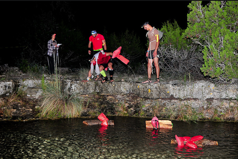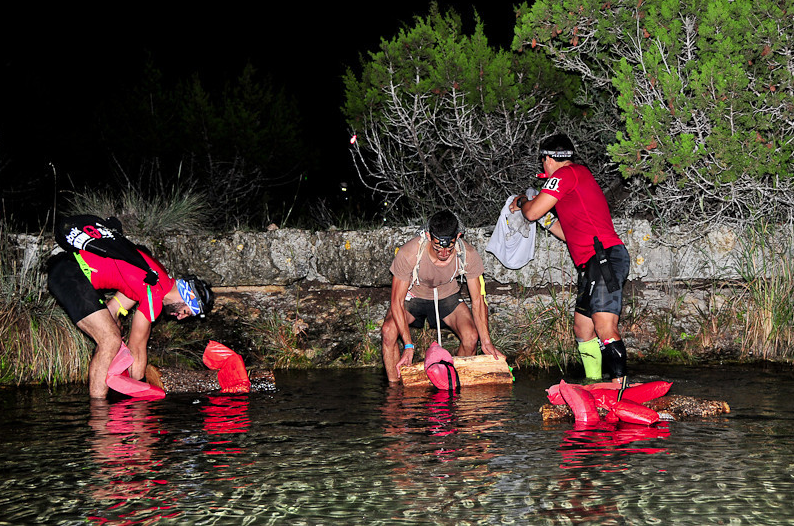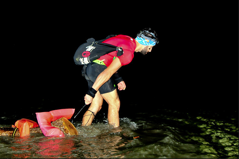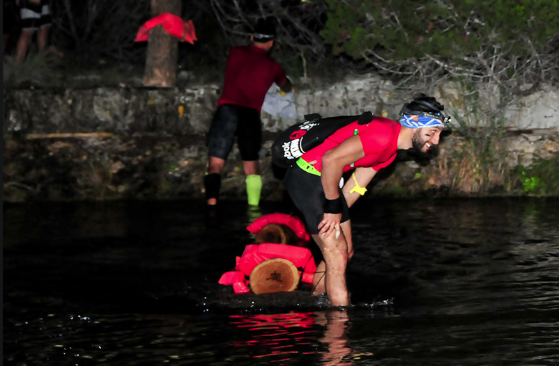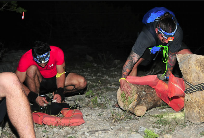 The descent in these sandals forced you to take extraordinary caution with each rock nearly slipping out from under you. Add in the darkness, prickly pear cactus and the heavy weight of the log and you’ve got yourself one of the most challenging combinations of misery you can imagine in a race. Well played, Josue. Half way down my lead toe knot pulled through the foot bed and I had to sit on my log and re-lace my entire sandal. Of course I was right next to a prickly pear cactus and had to remove a half dozen needles – they would not be the last that I removed from my feet. At the bottom of the wicked descent we were greeted by volunteers and instructed to attach a PFD (personal floatation device, aka a life vest) to our log. I took two life vests for mine as I was already a nervous wreck about swimming through this seaweed infested waters at night. I’m okay during the day, Corinne and I took a swim the day before, but in the darkness and over an extended distance. Anxious feelings and something my father told me about seaweed long ago crept into my mind and stirred a panic within me. “I can’t fuckin’ do this shit” was all I could think. That thought crossed my mind multiple times throughout this swim, but I fought my weak minded thoughts and pushed myself, and with the help of my fellow racers, continued moving into the water.